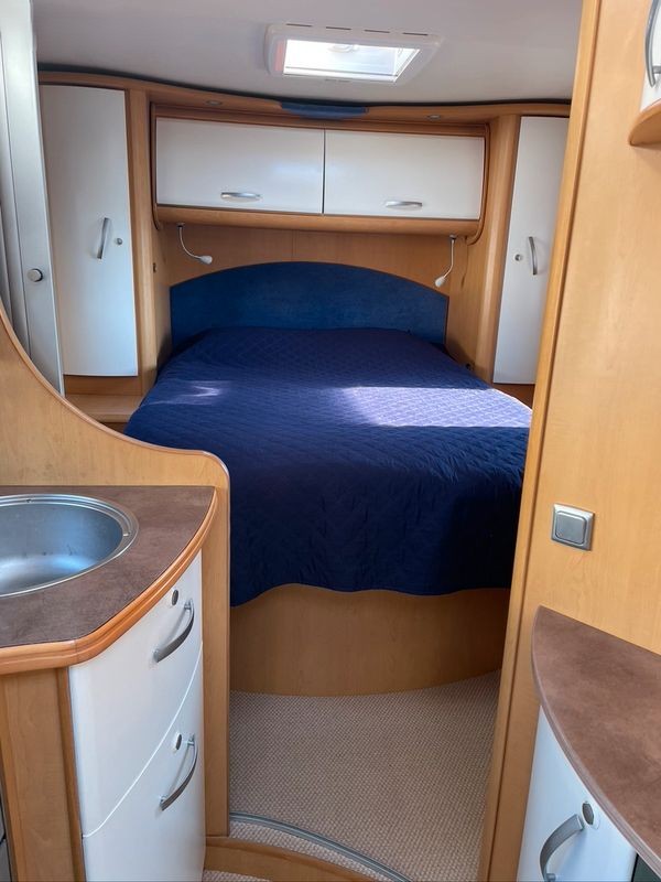 Zona de descanso con cama central trasera (140 x 215) y cama en cabina (140 x 190)
